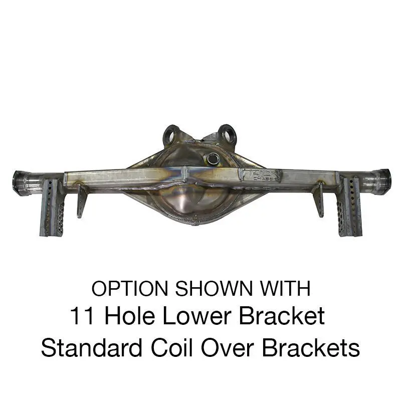 The housing features options like billet aluminum coilover brackets, weld-on adjustable spring perches, and four or 11 hole lower control arm mounting holes.